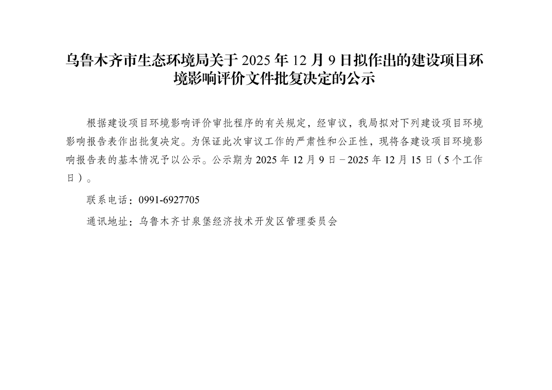 乌鲁木齐市生态环境局关于 2025 年 12 月 9 日拟作出的建设项目环境影响评价文件批复决定的公示