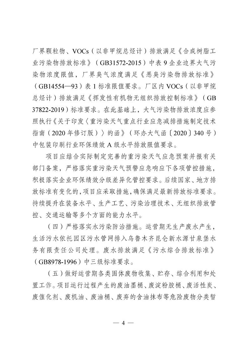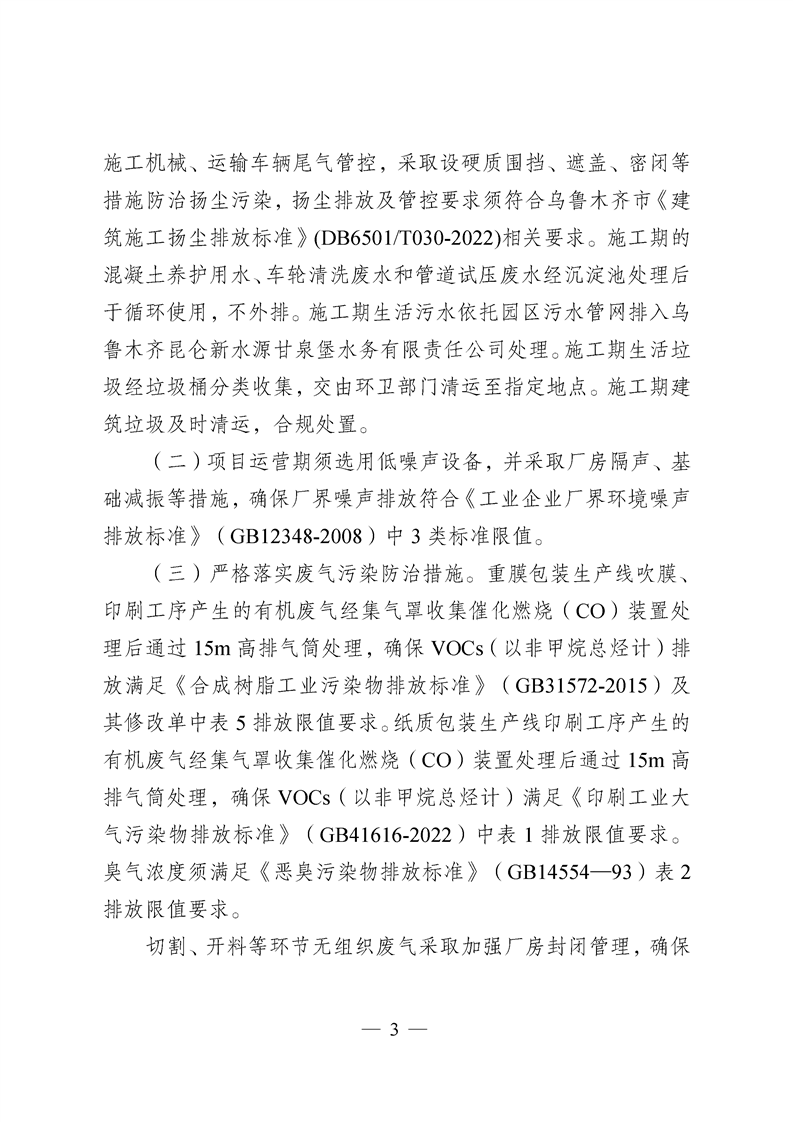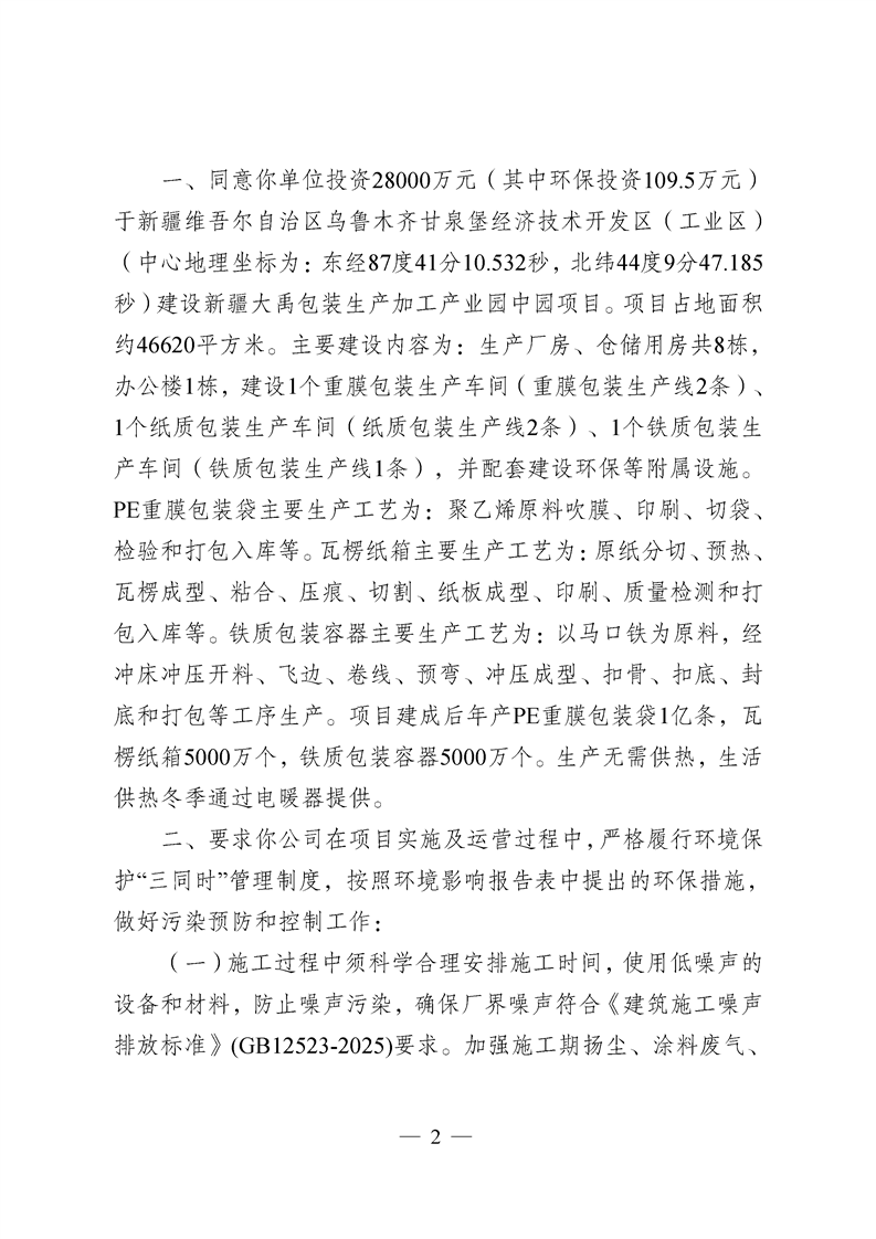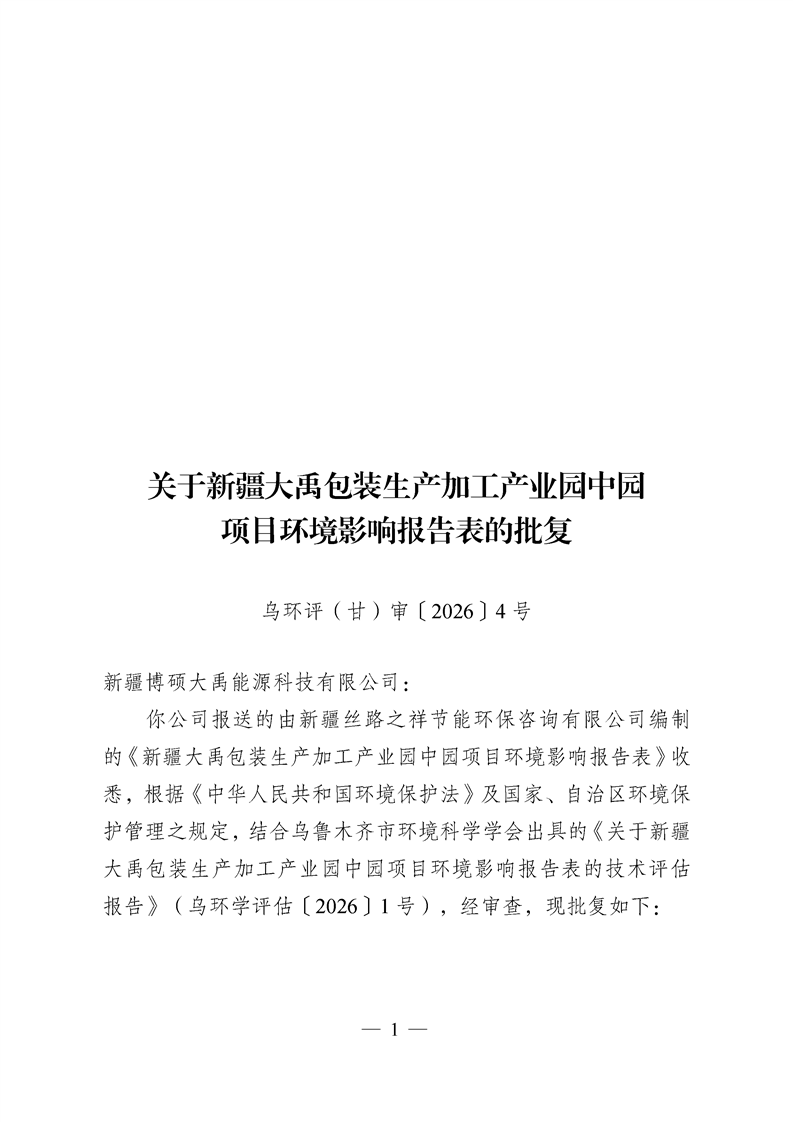 关于新疆大禹包装生产加工产业园中园项目环境影响报告表的批复