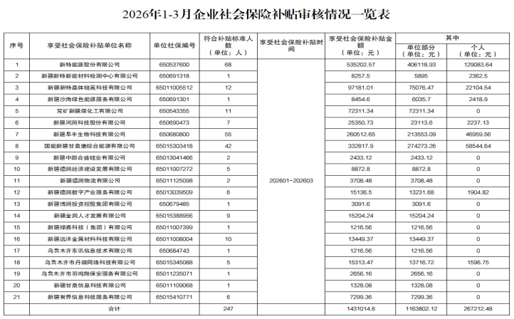 根据《关于印发<乌鲁木齐市社会保险补贴办法>的通知》 (乌人社规〔2021〕2号)文件要求,现将甘泉堡经开区园区企业2026年1-3月社会保险补贴资金申报审核情况予以公示: