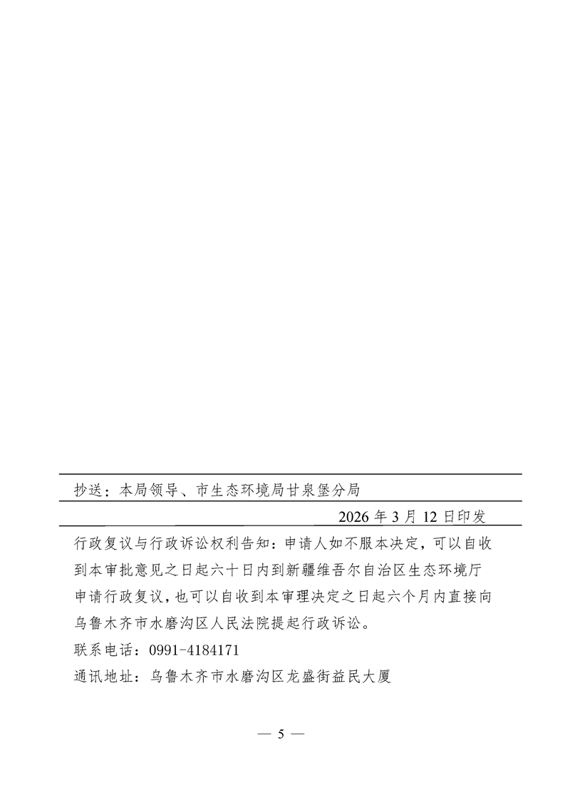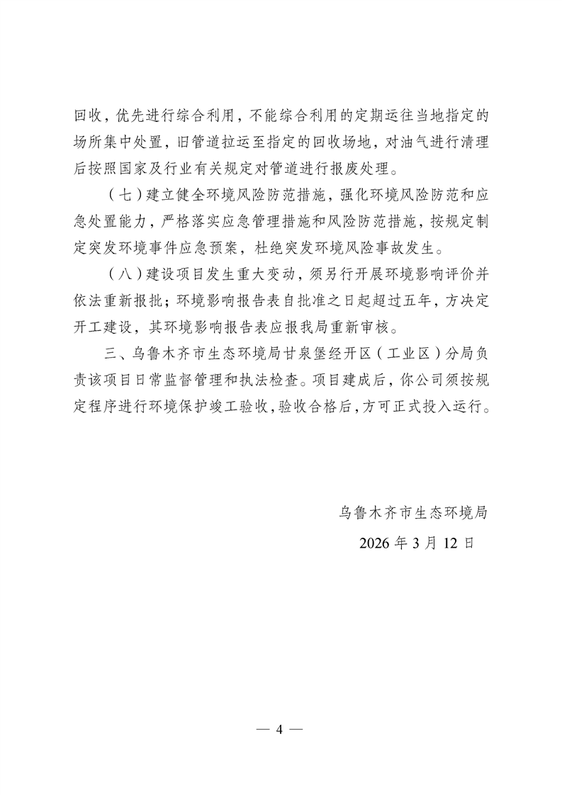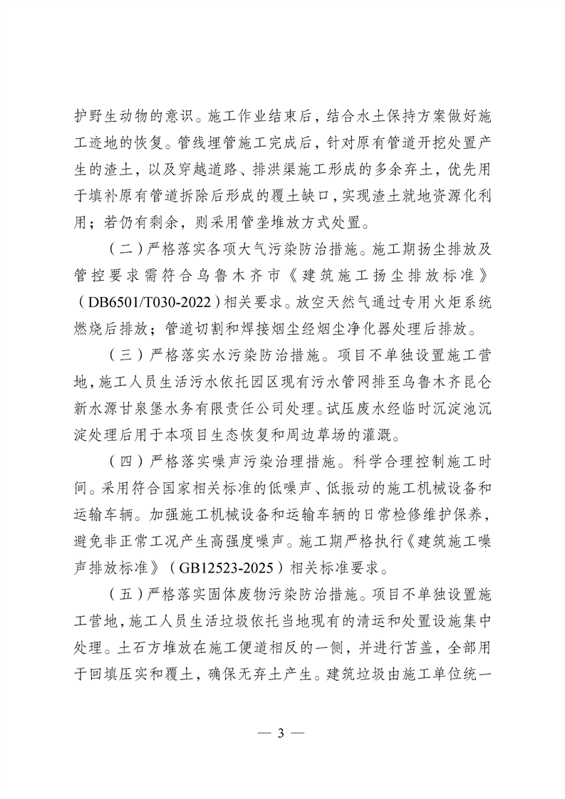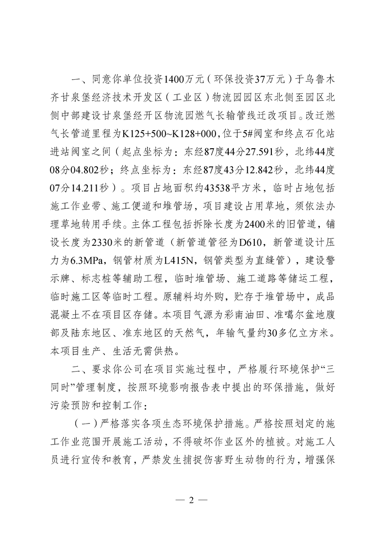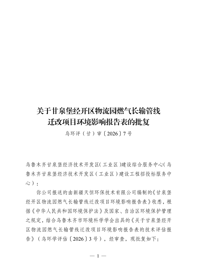 乌鲁木齐市生态环境局关于2026年3月12日作出的建设项目环境影响评价文件批复决定的公示(甘泉堡经开区物流园燃气长输管线迁改项目)